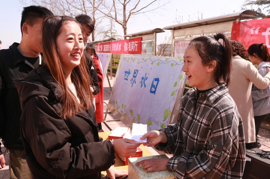3月22日中午,学院二号教学楼前,一场别开生面的活动吸引了众多师生。为纪念第二十七届“世界水日”,由团委学生处主办、院学生会承办的“节约用水 你我同行”节水知识科普宣传活动正在进行。