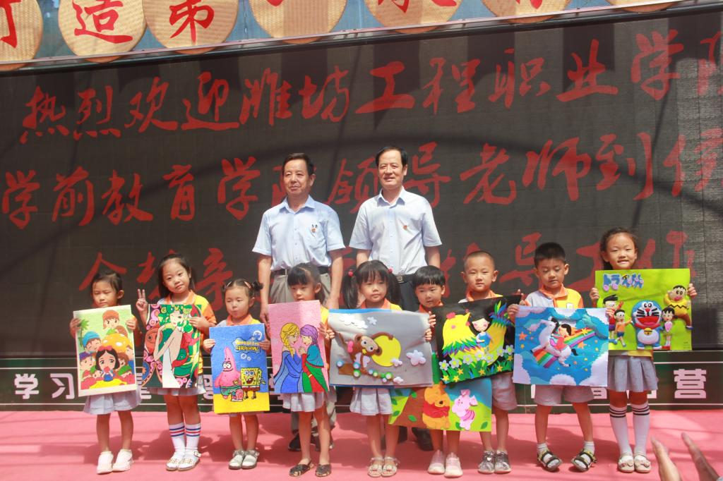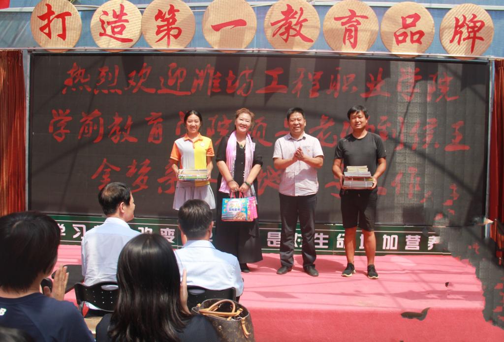 上午10点,志愿者们到达侯王社区金梦亲子营地,营地负责人、青州金翅膀幼教集团董事长曹金环详细介绍了营地建设情况及后续发展规划。学前教育学院党员充分发挥专业优势,为营地建设提供指导意见,向营地赠送了价值1400余元的图书,向小朋友们赠送了学前教育专业学生精心准备的不织布、纸浆画、剪纸等手工作品。舞蹈教师现场教学,与幼儿进行了友好互动。曹金环代表基地赠送锦旗,感谢志愿者们智力帮扶共育新苗,希望通过校地合作振兴乡村。最后,活动在志愿者与幼儿的大合唱《歌唱祖国》中结束。