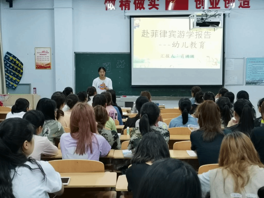 暑期赴菲律宾莱西姆大学研学的管子清、肖珊珊两位同学分别从不同角度进行了经验分享。管子清生动地讲述了在菲研学的见闻与感悟,表示非常感谢学院提供如此好的机会,才得以出国研学,此行收获满满,既开阔了视野,更坚定了出国留学的信心,她鼓励大家充分利用学院搭建的平台出国(境)学习深造。肖珊珊精心制作了PPT,图文并茂地展示了菲律宾莱西姆大学的教学设施、生活环境、师资情况、幼儿园教学环境等信息,为大家分析了国际化视野对学前教育国际班学生将来就业的优势。整个分享会,气氛热烈,她们精彩的分享不时赢得热烈掌声。