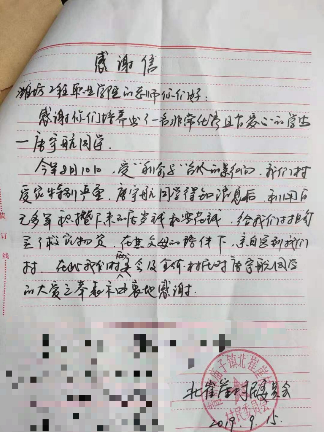 近日,学院收到来自北崔崖村委的感谢信,唐宇航同学的事迹才被我们所知。