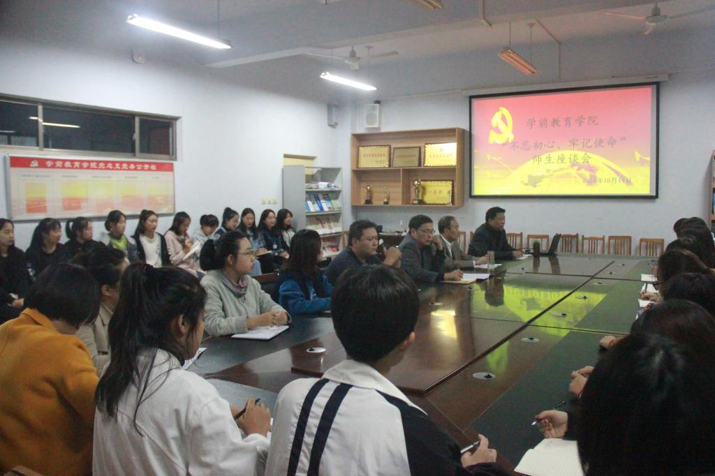 10月14日晚,学前教育学院“不忘初心、牢记使命”主题教育师生座谈会在5205会议室召开。学前教育学院学生管理、教学管理相关负责教师和2019级17个班级的班长、学习委员参加会议。