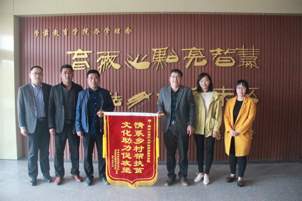 10月15日下午,潍坊市委政研室驻昌乐县朱刘街道小东庄村第一书记田道兵会同小东庄村村委负责人专程赶到潍坊工程职业学院,送上“情系乡村帮扶贫,文化助力促攻坚”锦旗一面,以表达对学前教育学院师生用墙绘为小东庄村添乡韵的真诚谢意。