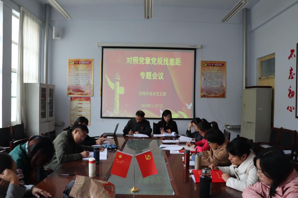按照“不忘初心、牢记使命”主题教育要求,11月7日下午,应用外语系党支部在3202会议室召开对照党章党规找差距专题会议。应用外语系党支部书记主持会议,支部全体党员及部分预备党员参加。
