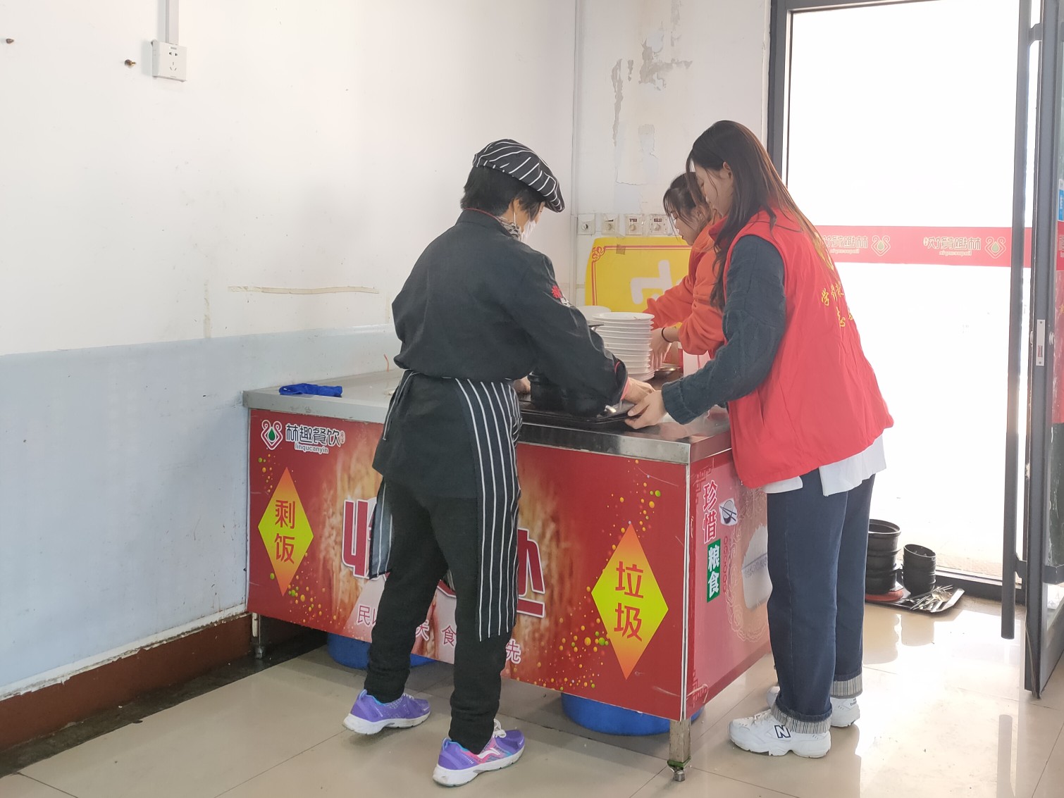 志愿者们分为四队,一队负责维持就餐秩序,二队负责劝导同学们节约粮食,三队负责把餐余垃圾正确放入垃圾桶,四队负责帮助清洁工打扫餐厅卫生。他们分工明确,不怕辛苦,带动就餐同学养成良好就餐习惯,营造干净整洁的就餐环境。