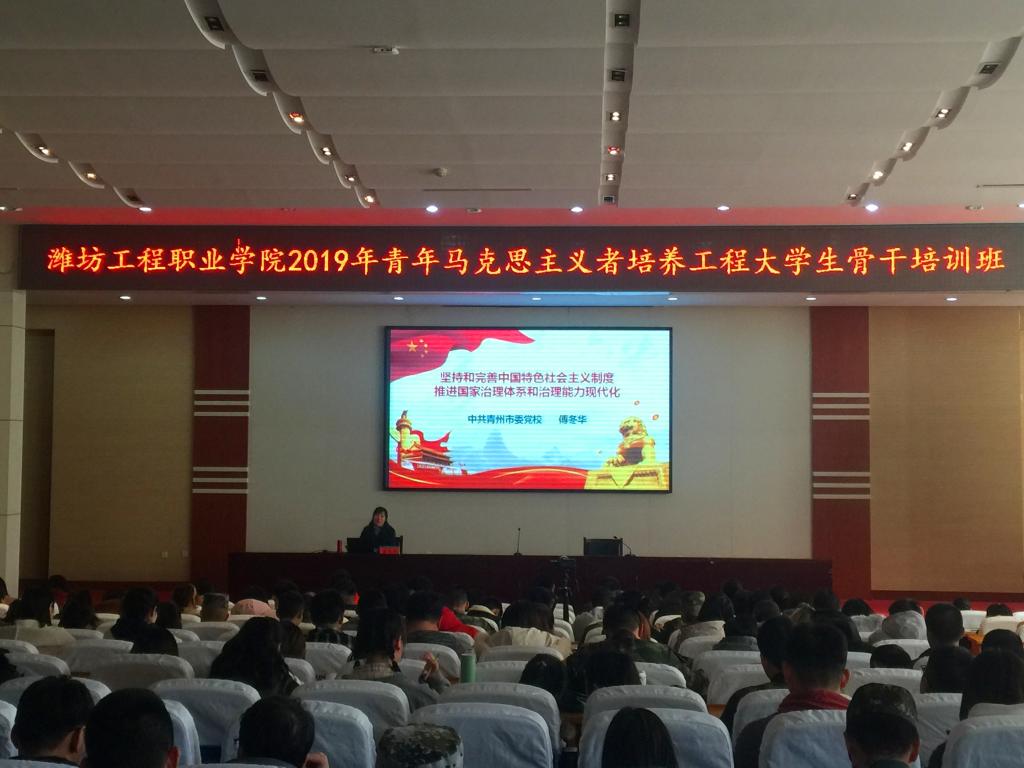 12月12日下午,团委学生处邀请青州市委党校副校长、高级讲师傅冬华在学术报告厅为2019年青马培训班学生骨干做了十九届四中全会精神报告会。团委学生处主要负责同志、各系院团总支书记、院系两级主要学生干部听取报告会。