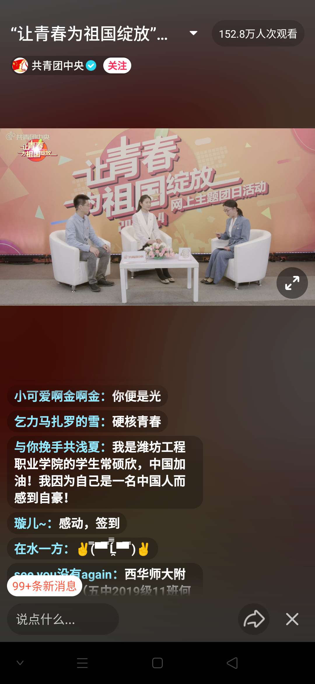 5月4日上午10时,共青团中央以举办了“让青春为祖国绽放”网上主题团日活动。我院团员青年准时走进直播间,通过微博、微信、B站等各大网络平台@共青团中央账号,与全国青年一起为伟大的祖国发声,弘扬青春正能量。