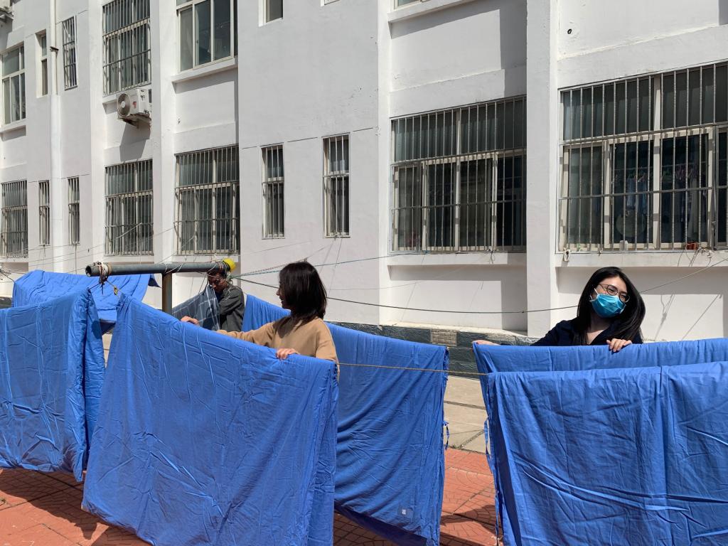 疫情防控期间,学生宿舍自寒假后一直处于严格封闭状态,宿舍内的被子等床上用品不同程度出现了受潮情况。为保障返校后学生身体健康,应用外语系的辅导员和教师一早就在宿舍楼内外忙碌了起来,她们有的在擦拭晾衣绳,有的在贴标签,有的在取被子。很快,宿舍楼下的晾衣绳上就摆满了被子。经过晾晒后,下午一床床被子又被悉心收回,送回相应宿舍的相应床位。