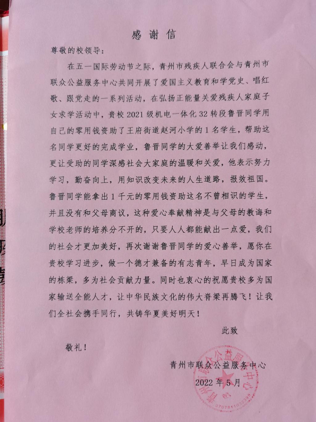近日,青州市残疾人联合会和青州市联众公益服务中心向机电工程学院发来感谢信和荣誉证书,信中对机电工程学院2021级机电一体化技术(三二连读)班的鲁晋同学关爱残疾人的善举表达了赞扬和感谢。