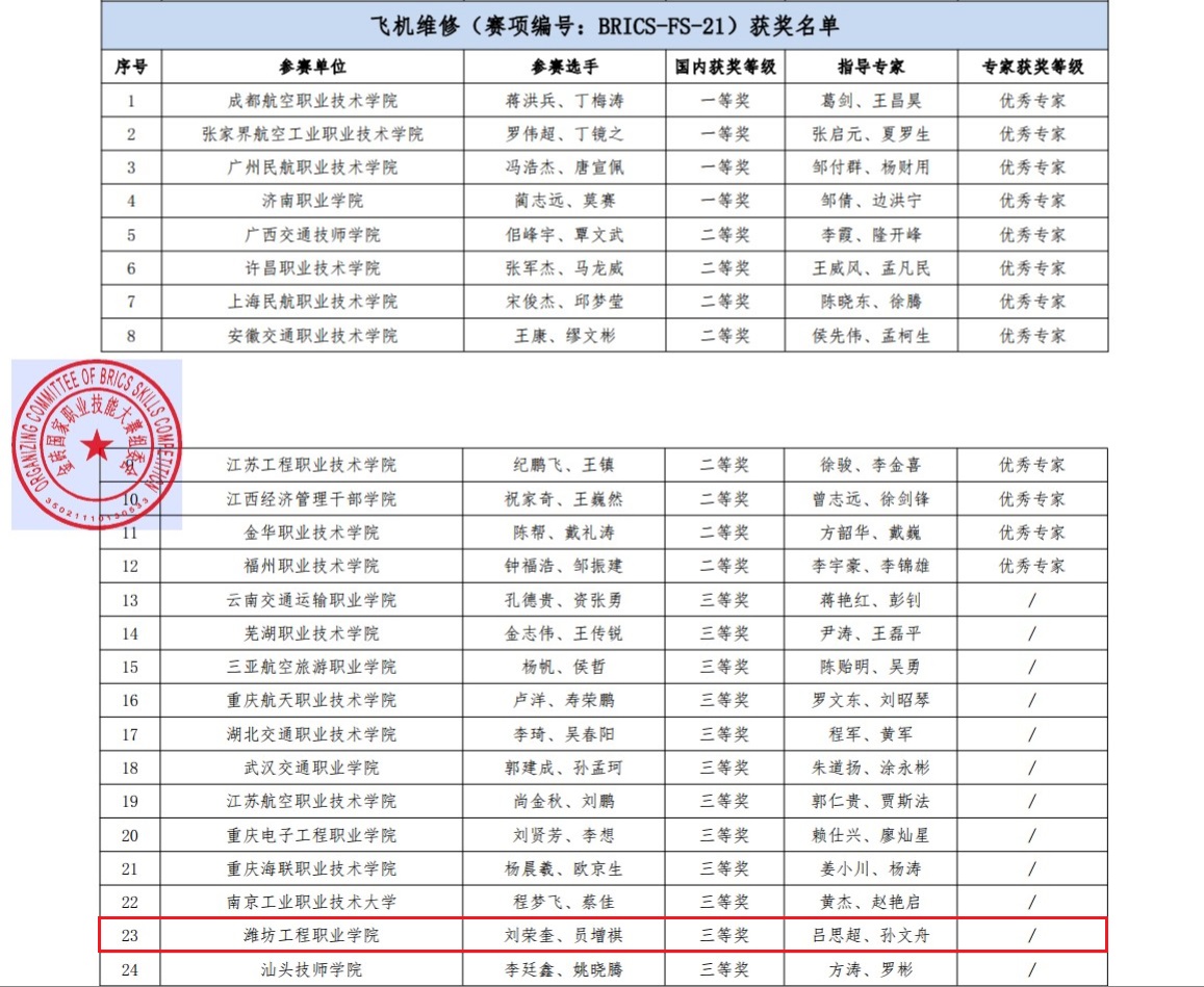 金砖国家职业技能大赛是今年我国作为主席国在金砖国家合作机制下举办的第一届职业技能大赛。大赛聚焦高端制造、数字经济、新产业、新业态、新技术等重点领域,共26个赛项。其中飞机维修赛项包含直升机日常检查、航空发动机维护和飞机液压系统排故三个模块。吕思超、孙文舟老师指导的2021级飞机机电设备维修专业刘荣奎、员增祺同学以总排名第一的优异成绩代表山东省参加总决赛,在备战国赛过程中,他们充分磨练技能,连续开展多轮次高强度模拟训练,在比赛过程中展现出高超的竞技水平。