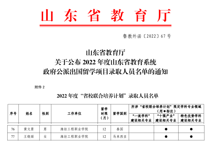 近日,山东省教育厅公布2022年度山东省教育系统政府公派出国留学项目“省校联合培养计划”录取人员名单,我院教师教育学院王晓丽、中专教学部黄文景2名教师入选,将分别赴泰国、马来西亚进行为期12个月的学习深造。