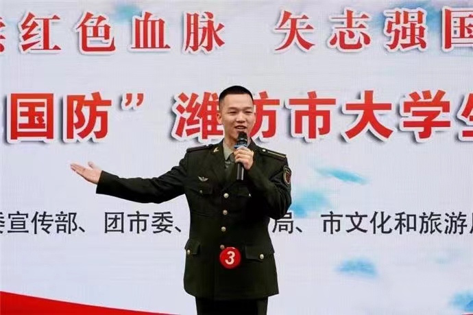 近日,由中共潍坊市委宣传部、共青团潍坊市委、潍坊市教育局、潍坊市文化和旅游局、潍坊军分区政治工作处联合举办的第四届“爱我国防”大学生主题演讲大赛决赛在潍坊日报社融媒体中心城市发布厅举行。比赛中,我院参赛选手围绕“赓续红色血脉,矢志强国强军”的主题,结合自身成长经历,抒发了用青春报效祖国的使命情怀。凭借优秀表现,我院2020级定向培养军士王雨阳凭借《我的荣耀》荣获全市第三名,团委学生处教师杨智胜荣获“优秀指导教师”。