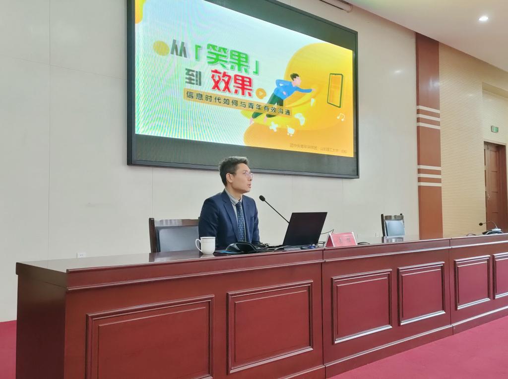 大讲堂由教育部高校优秀中青年思想政治理论课教师择优资助项目负责人、教育部全国高校网络教育名师、山东省学校思想政治理论课“金课”项目负责人、山东理工大学马克思主义学院思政课教师岳松担任主讲。讲堂上,岳松以《信息时代如何与青年沟通》为题,从融媒体时代沟通交流的误区、当代中国青年受众的身心特质、从“迎合”青年到赢得青年三个部分,深入浅出地分析了与青年学生进行有效交流和沟通的方法与技巧,并结合学生教育管理工作中遇到的实际问题与大家进行了探讨,给全体老师呈现了精彩的一课。