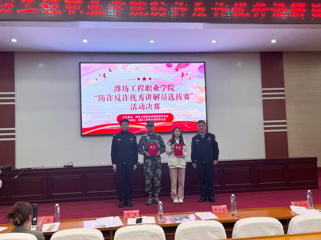 4月6日,“防诈反诈优秀讲解员选拔”决赛在学术报告厅举办。共有20位个人组选手、10组团体组选手入围决赛。比赛邀请青州市公安局反电信网络诈骗大队教导员田世龙、反电信网络诈骗大队中队长庞伟以及学校党政办公室法制科负责人担任评委。决赛现场,选手围绕48种常见诈骗手段等内容,结合PPT、短视频以及情景演绎等形式将防诈反诈的理论知识融入到日常生活中,声情并茂、生动形象的讲解引发了现场观众的深刻思考和共鸣,掌声阵阵。经过激烈角逐,个人组选手孙文莹,团体组选手杜锡崟、王靖尧、孟令杰、陈浩浩、王金宇、田相伟获得一等奖。比赛还评选了二等奖、三等奖和优秀奖。