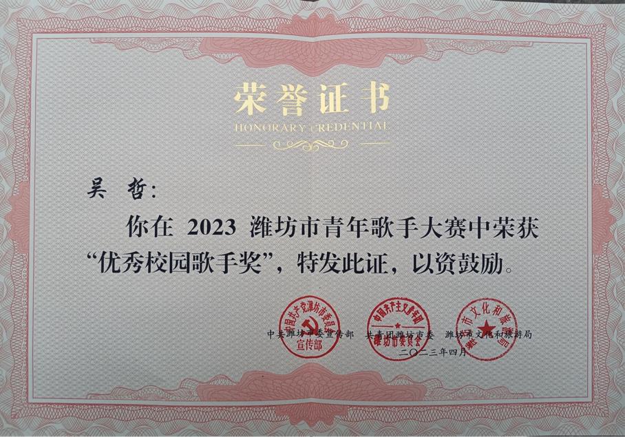 4月12日,由中共潍坊市委宣传部、共青团潍坊市委、潍坊市文化和旅游局共同举办的2023年潍坊市青年歌手大赛圆满落下帷幕。经过初赛、复赛、决赛的激烈角逐,由凤凰艺术学院教师杨哲所指导的2021级音乐表演班吴哲同学在大赛中荣获“优秀校园歌手奖”。