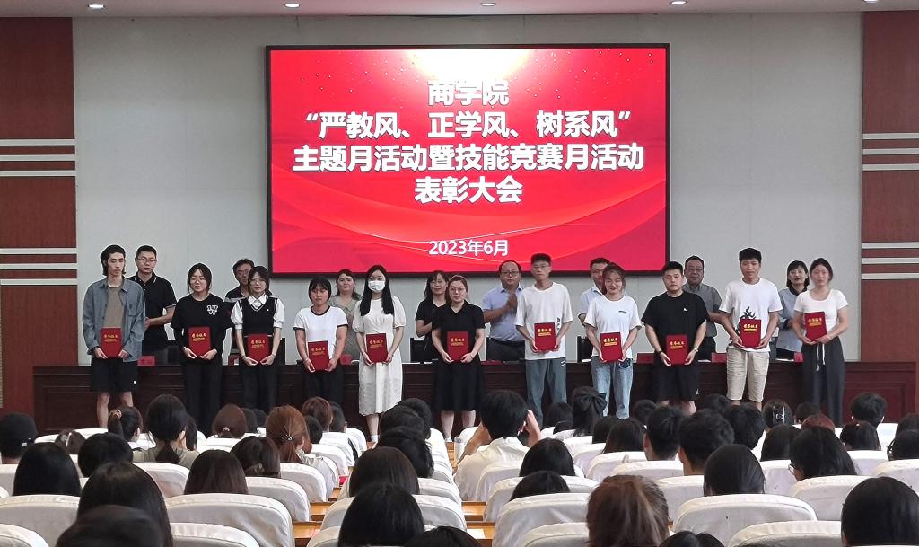 会上对优秀教师、优秀班级和优秀学生进行了表彰。商学院主要负责人表示,教风、学风、系风建设和技能竞赛月活动是助推学校“双高”创建的重要举措,广大师生积极参与,教师师德修养增强,学生学习气氛浓厚,展现出朝气蓬勃的精神风貌;希望在三下乡教育实践活动、教育管理、教育教学等方面涌现出的优秀个人和集体,充分发挥模范带头作用,珍惜荣誉、再接再厉。